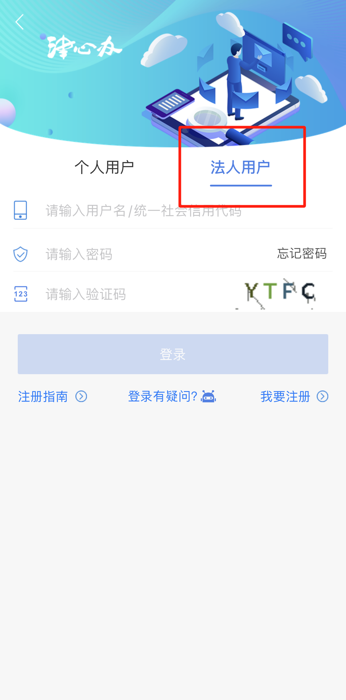打开“津心办”APP,使用企业法人信息登录。
