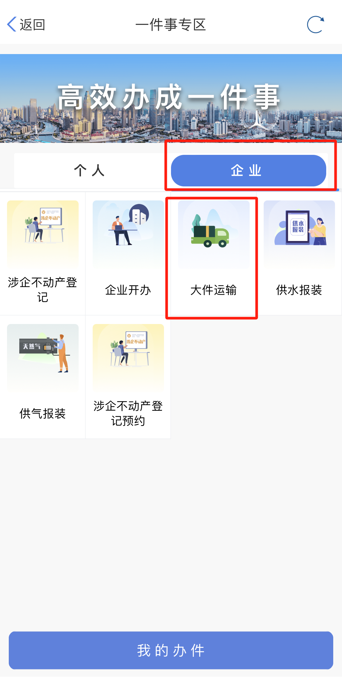 在威尼斯人娱乐场找到“高效办成一件事”重点事项服务专区并点击进入,选择企业事项,选择“大件运输”。