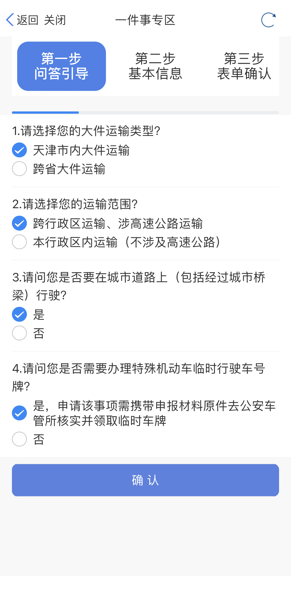 按您的需求勾选问答引导选项,随后核对信息、上传材料,一站式提交。