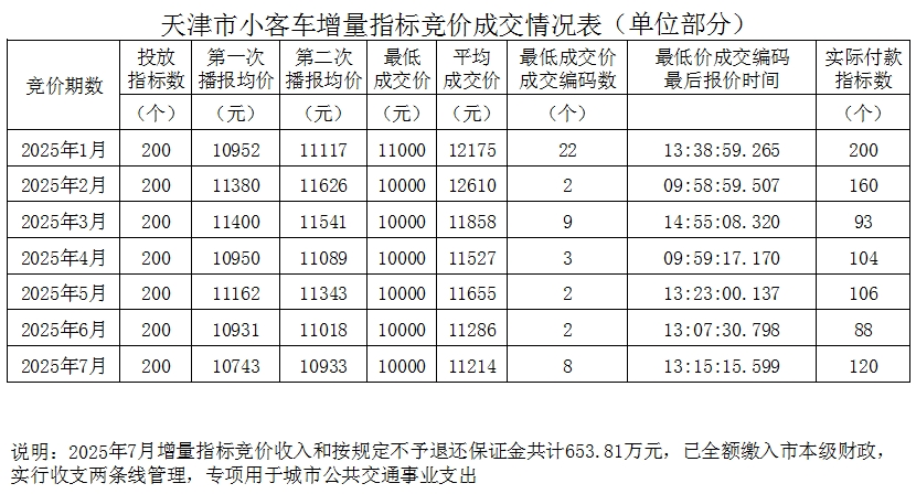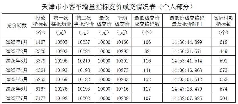 2025年天津小客车增量指标竞价成交情况表(截至7月)